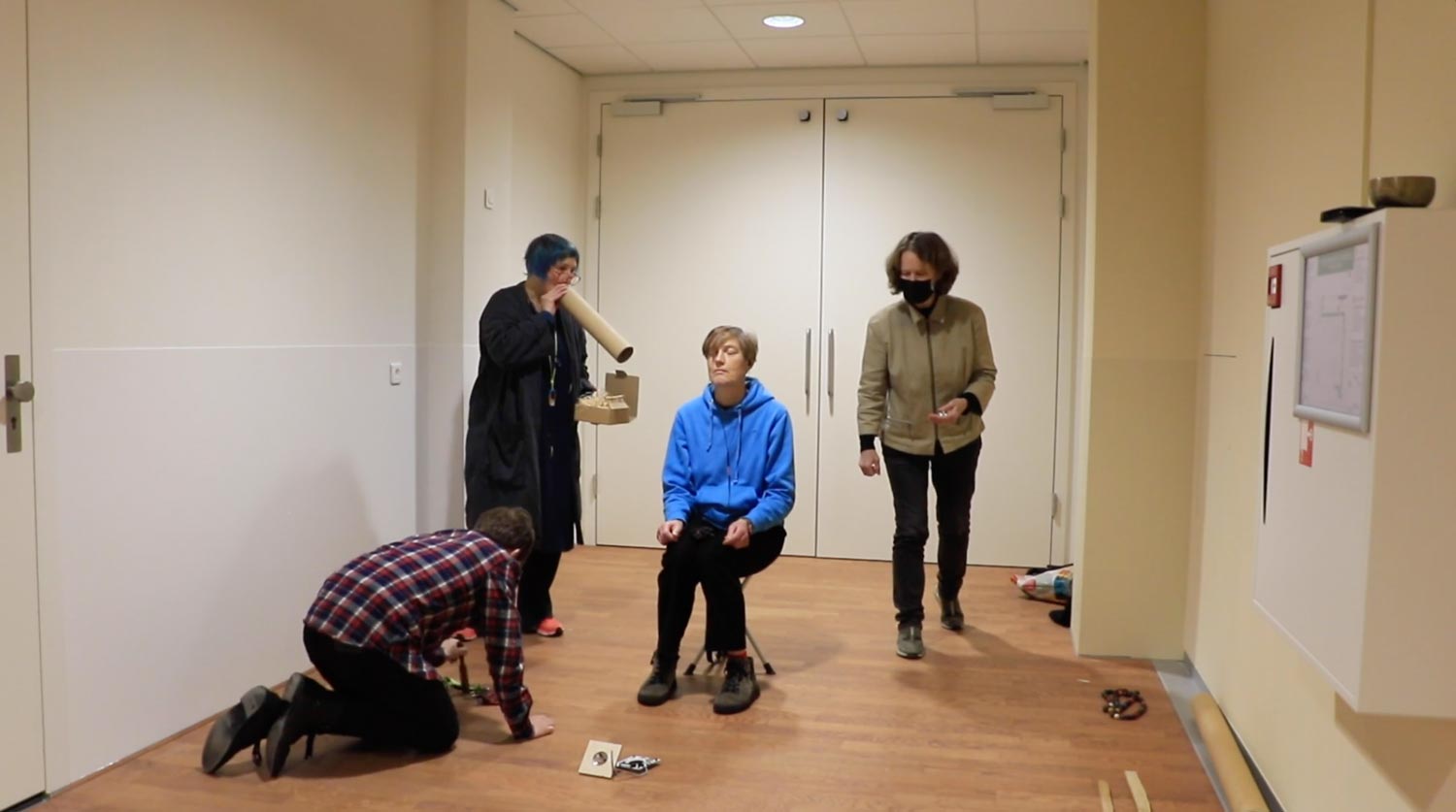 listening, playing and recording right near the entrance to the hallway. Like this it is easier to hear the enormous reverb in the empty hallway. Juan, Kristin and Anne are playing, Mariette is listening.